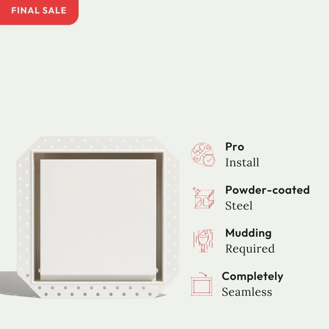 Ultra-minimalist mount for alarm keypads, smart thermostats like Google Nest, ecobee, and other small devices. The recessed, powder-coated steel mount features a hinged door and sits flush for a seamless finish that blends into the wall. Once closed, only a subtle rectangular groove remains visible. Pro install in 30 minutes. Requires drywall mudding.
