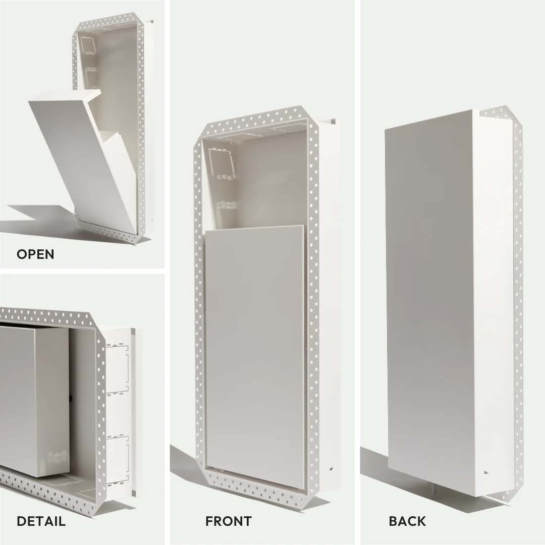 Ultra-minimalist recessed cubby with hinged door to hide spare toilet paper, trash bin, toilet brush, and other unsightly essentials, whilst optimizing space in small bathrooms. Customizable with a flush finish for a seamless design that blends right into the wall. Pro install in 30 minutes. Requires drywall mudding.